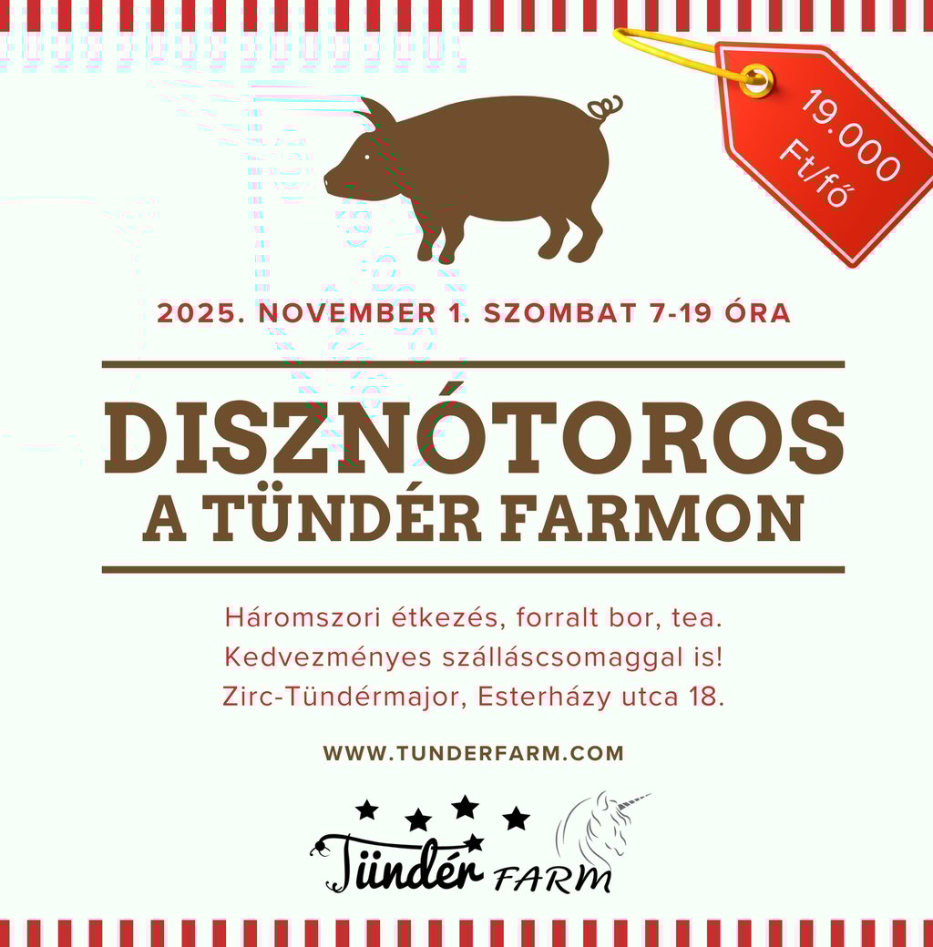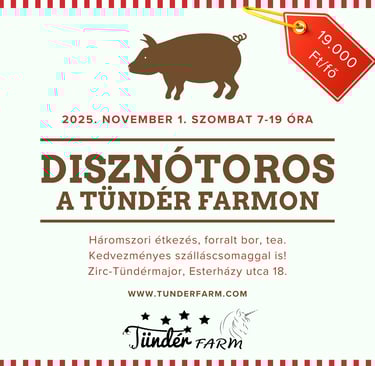 November 1-jén hagyományos disznótoros napra várjuk vendégeinket a Tündér Farmon. A nap során mindenki betekinthet a disznóvágás és feldolgozás vidám, közösségi hangulatába: lesz pálinkakóstolás, kolbásztöltés, hagyományos toros reggeli, ebéd, vacsora és sok nevetés.